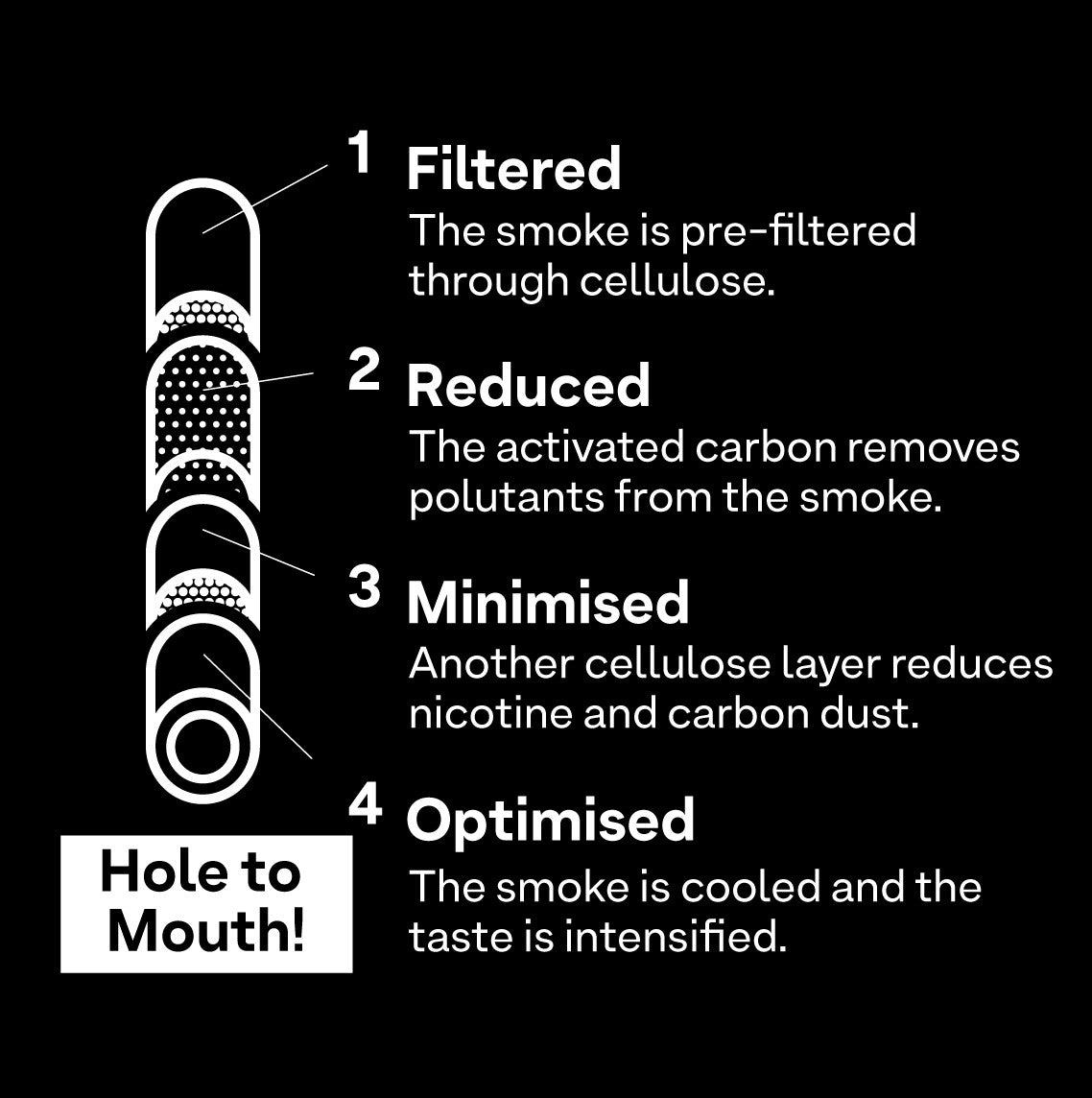 Olvídate de esos otros "filtros activados" que probaste antes - nuestro exclusivo proceso patentado de filtración en cuatro etapas significa que no más polvo de carbón activado en tu lengua o en tus labios.