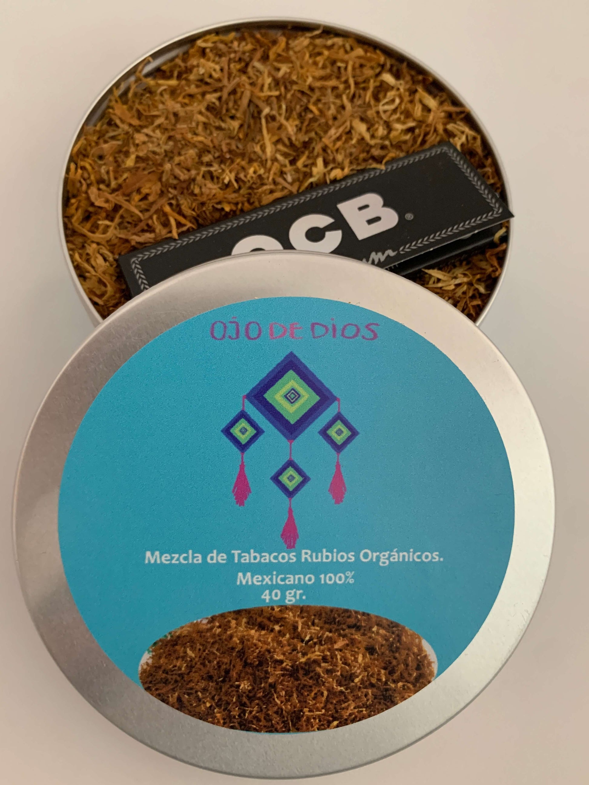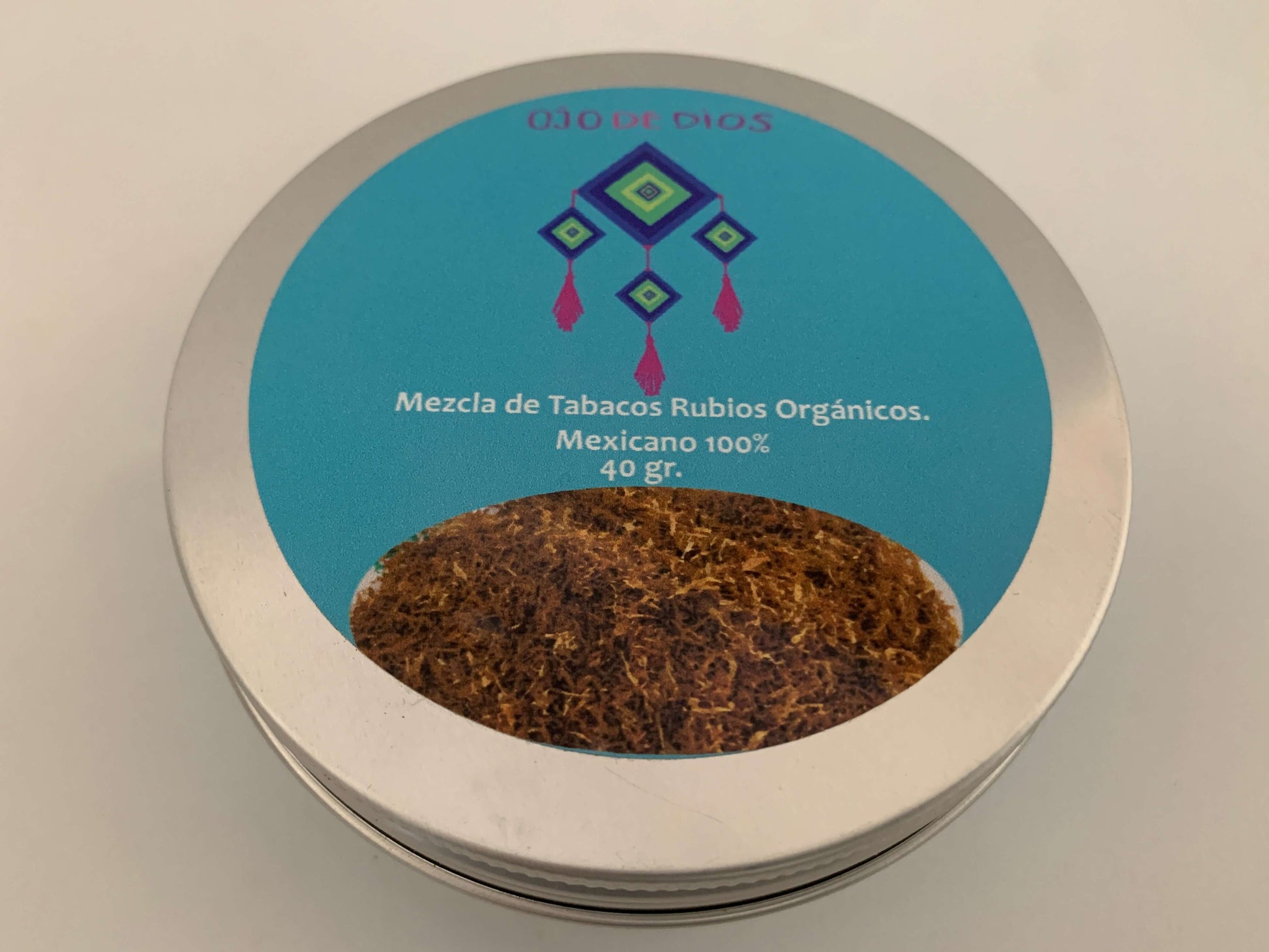 Mezcla premium orgánica de tabacos rubios Ojo de Dios (40 gramos) empacado en lata sellada y un pequeño disco de cerámica para mantener el control perfecto de humedad en el tabaco.